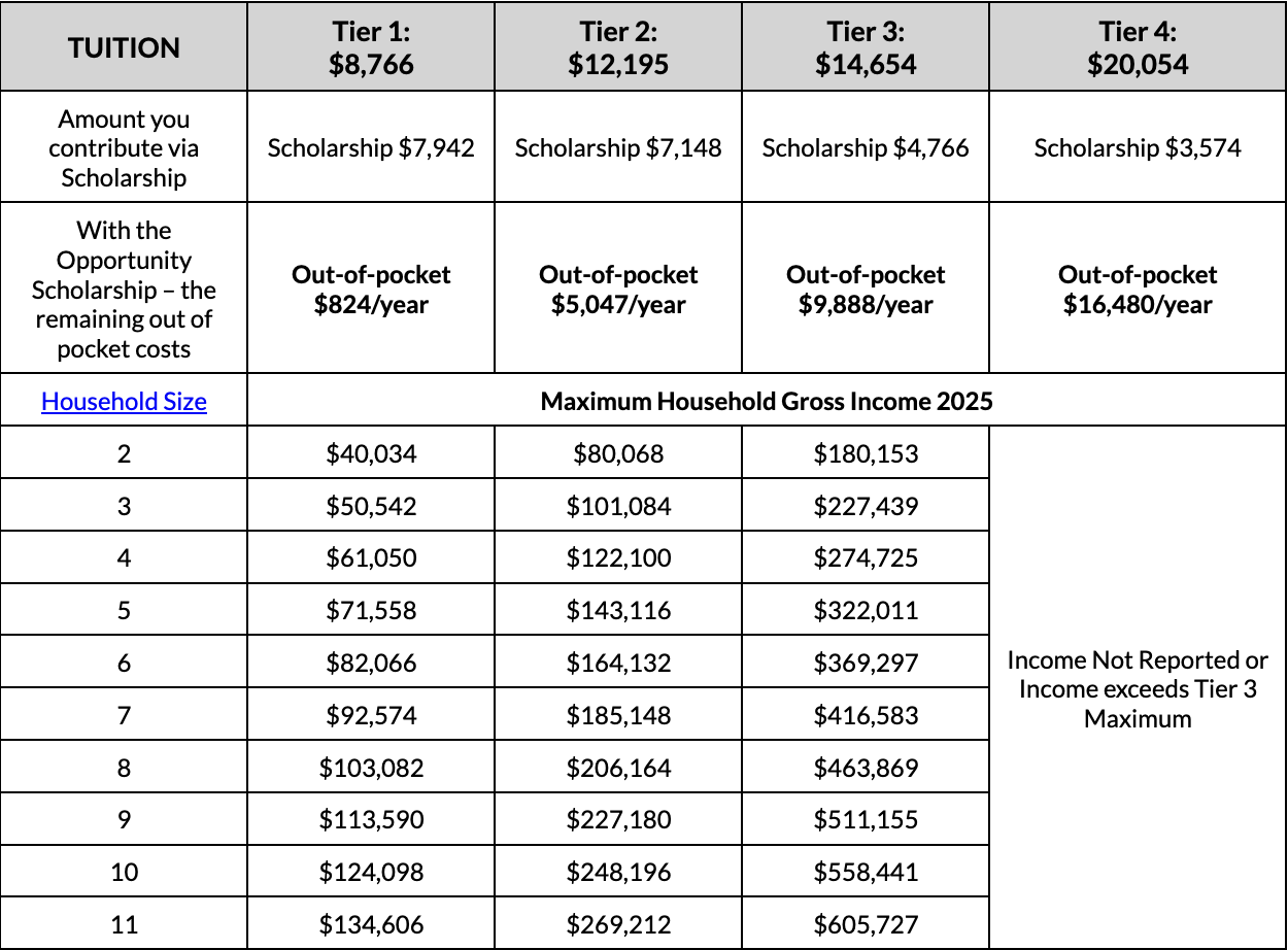 Our tuition tiers are structured in alignment with the criteria used to determine the amount your family is eligible for under the Opportunity Scholarship. Review the guidelines for determining household size and income.